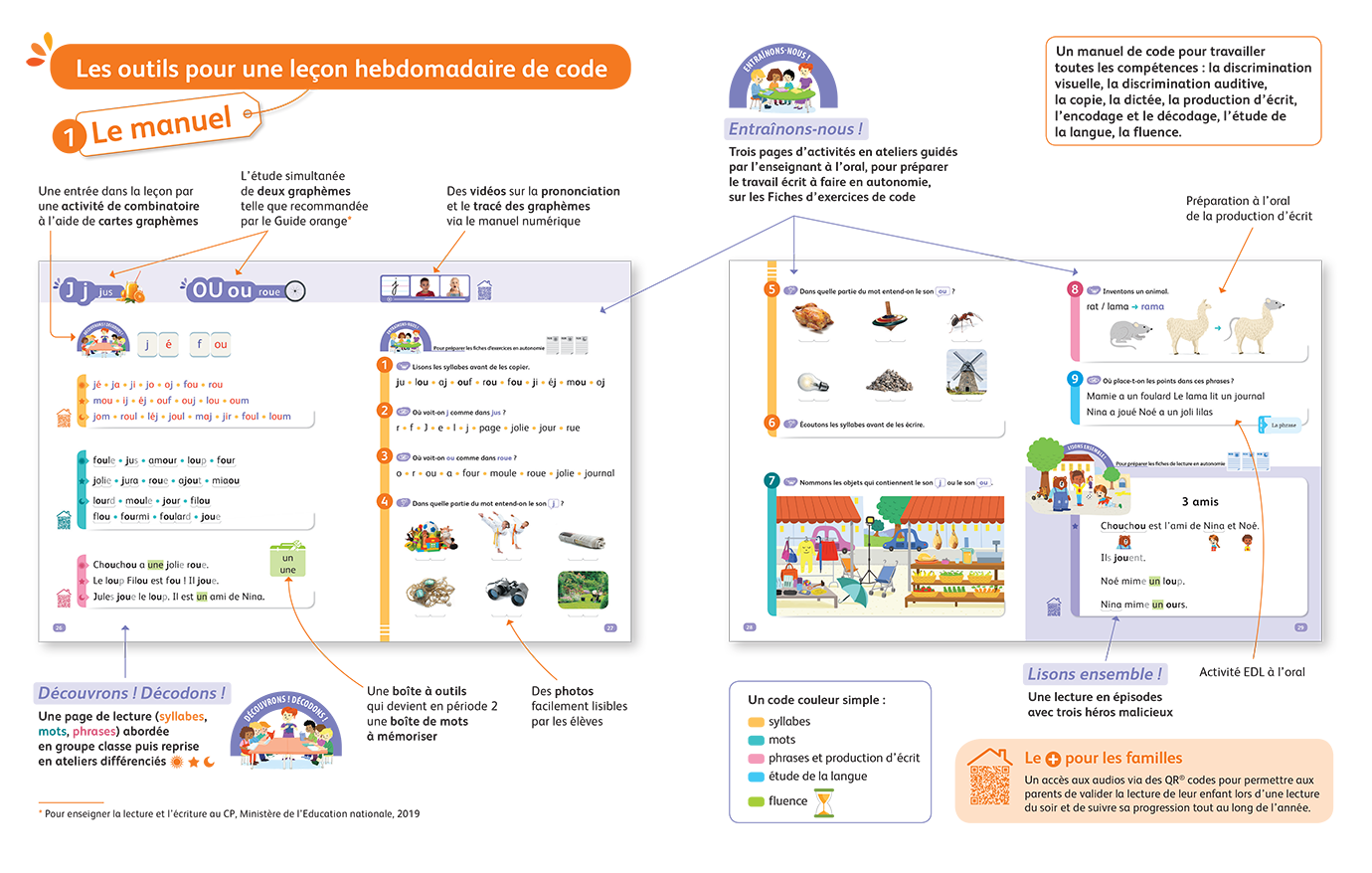 - Une méthode complète : code, lecture compréhension, geste d’écriture, copie, dictée, production d’écrit, étude de la langue.