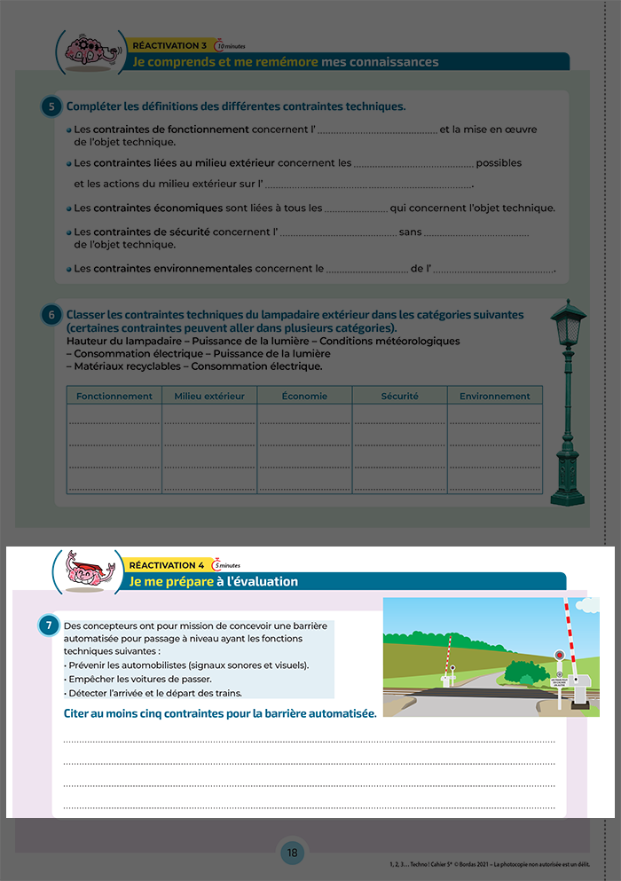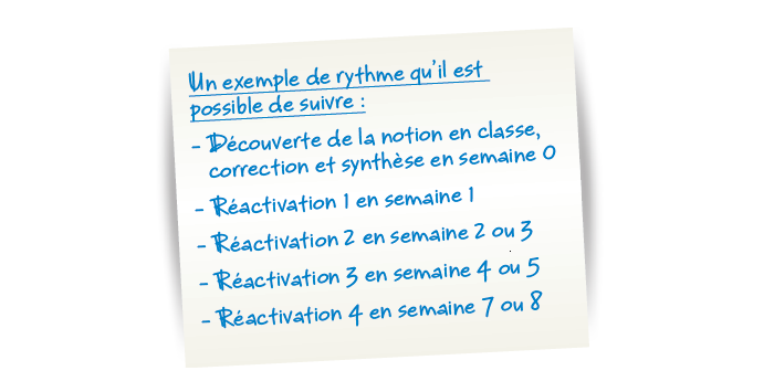La méthode appliquée dans les cahiers est basée sur 4 réactivations. Vous êtes libres dans le choix des temporalités entre les séries de réactivations et pourrez les adapter en fonction de vos besoins en classe (voir ci-dessous). Néanmoins, ces réactivations doivent se faire sur des temps de plus en plus espacés afin d’améliorer le temps de récupération en mémoire de la connaissance traitée par les élèves. Afin de gérer au mieux ces réactivations, des outils sont disponibles dans les cahiers et en téléchargement sur le site technologie.editions-bordas.fr :
