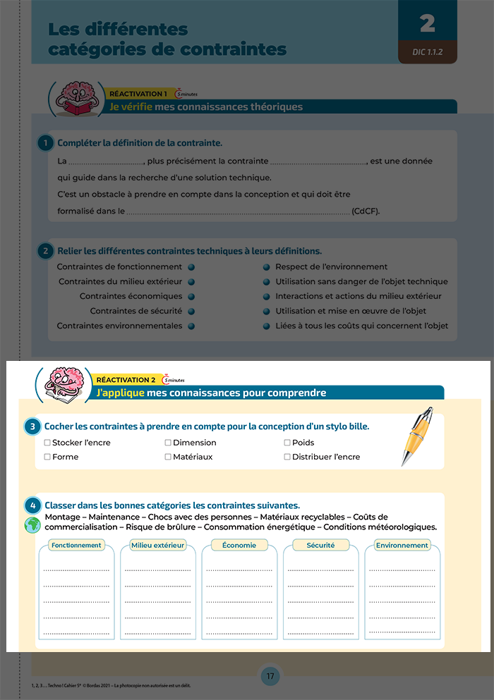 La méthode appliquée dans les cahiers est basée sur 4 réactivations. Vous êtes libres dans le choix des temporalités entre les séries de réactivations et pourrez les adapter en fonction de vos besoins en classe (voir ci-dessous). Néanmoins, ces réactivations doivent se faire sur des temps de plus en plus espacés afin d’améliorer le temps de récupération en mémoire de la connaissance traitée par les élèves. Afin de gérer au mieux ces réactivations, des outils sont disponibles dans les cahiers et en téléchargement sur le site technologie.editions-bordas.fr :