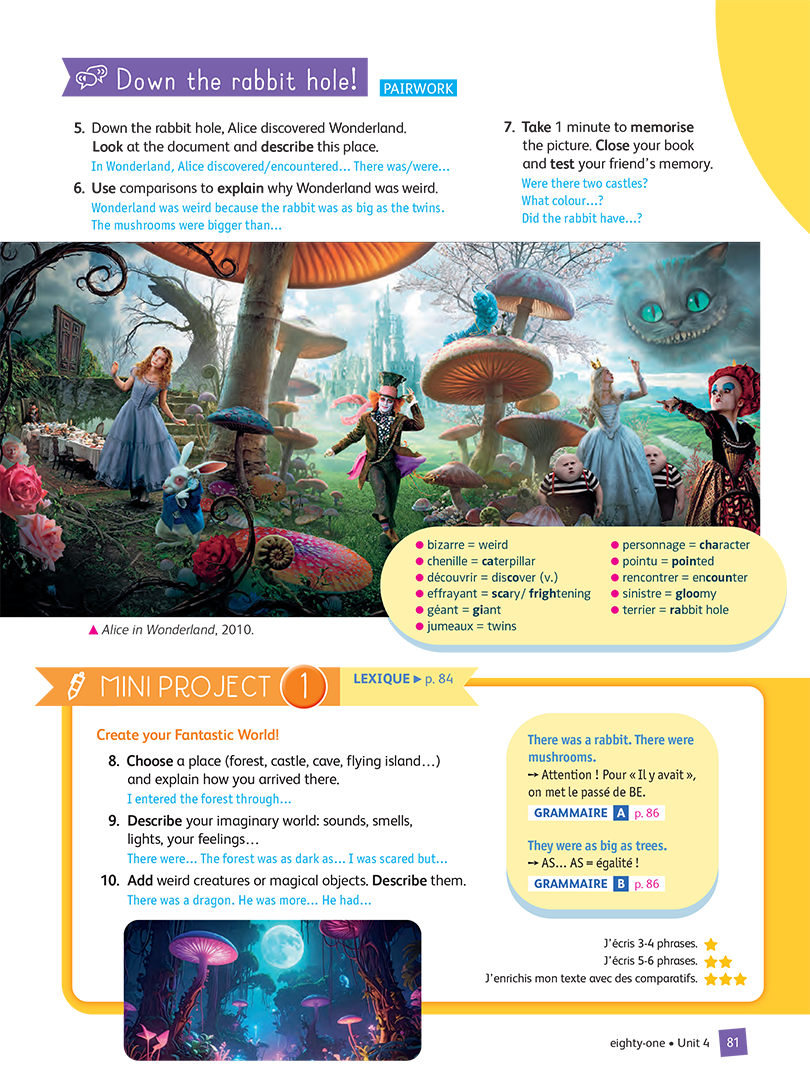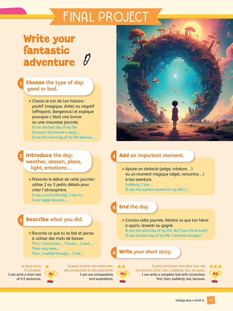 - MINI PROJECT: un projet intermédiaire , à réaliser à l’oral ou à l’écrit, conclut la double-page et prépare au projet final.