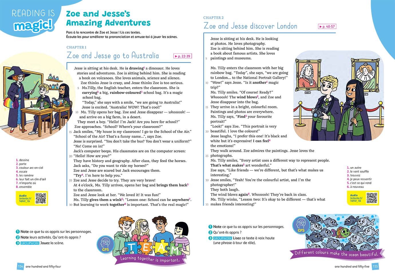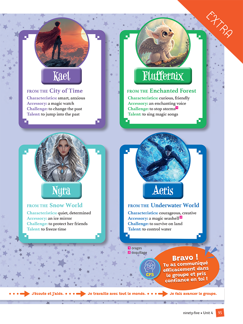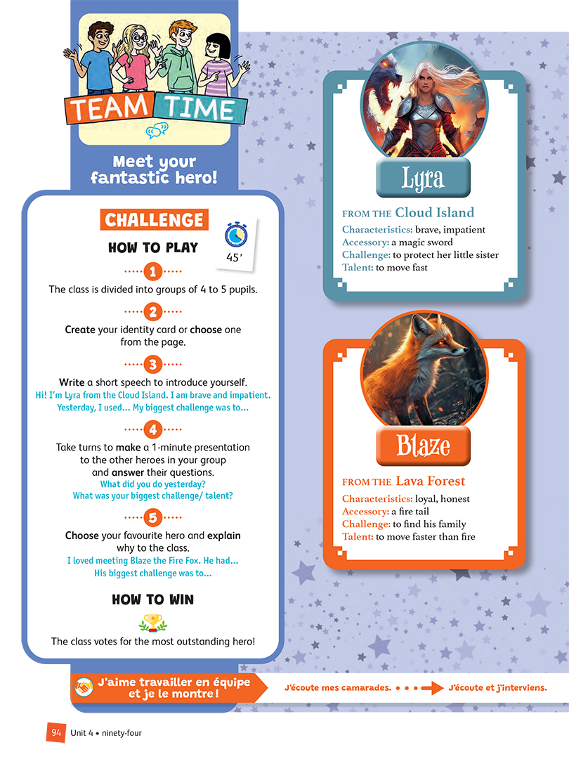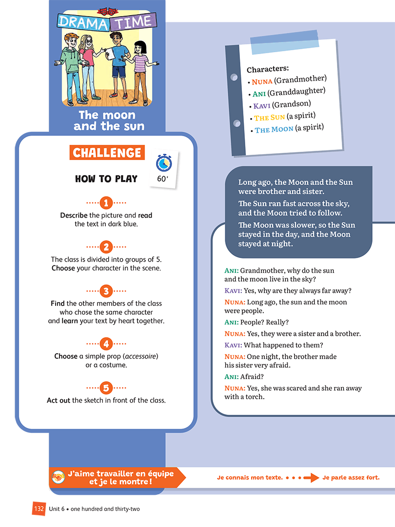 - Une double-page finale optionnelle pour développer la coopération en classe : TEAM TIME ou DRAMA TIME