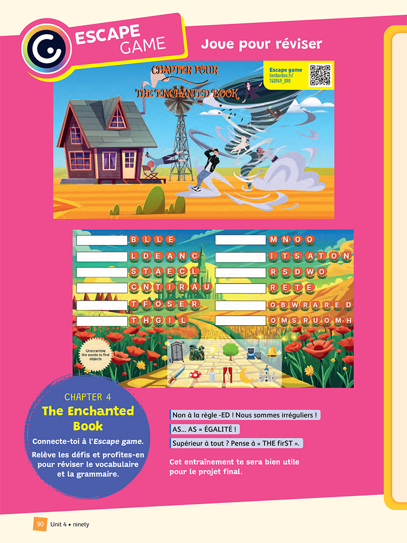 - Dans chaque unité, un escape game innovant est proposé à l’élève. Celui-ci suit des personnages récurrents au sein d’univers séduisants liés à la thématique.