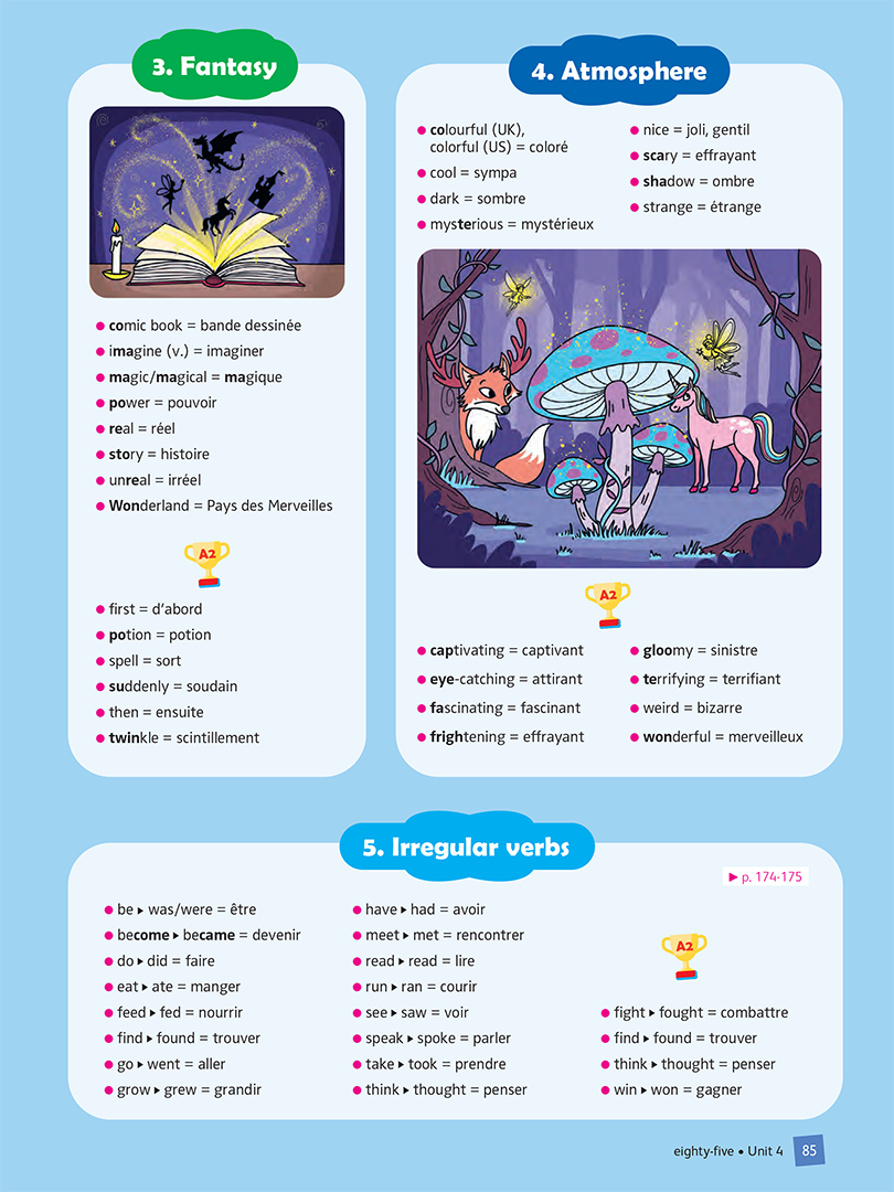 - Un cahier d’activités favorisant l’entraînement et l’auto-évaluation à l’aide de critères différenciés avec des stickers pour mémoriser les points grammaticaux et les verbes irréguliers et visualiser ses réussites.