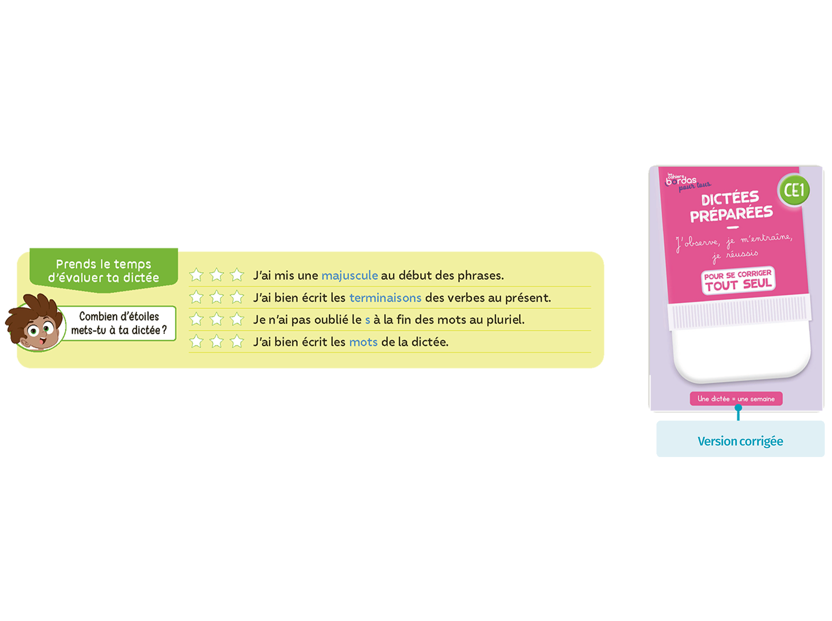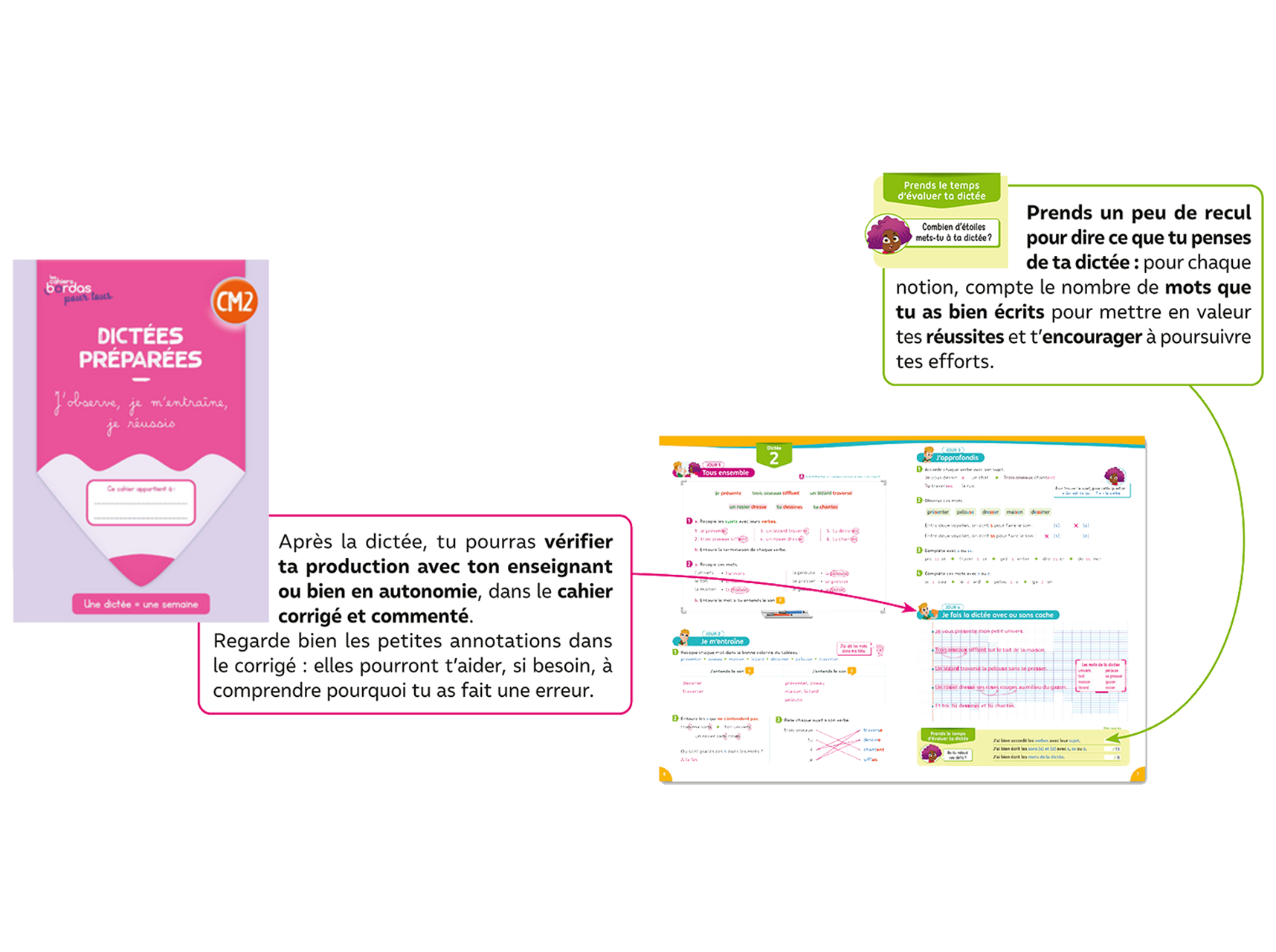 Le dernier jour est consacré à l’écriture de la dictée, avec ou sans cache pour une meilleure différenciation. Les élèves, grâce à la répétition, ont mémorisé l’orthographe des mots et ont compris et assimilé certains mécanismes grammaticaux. Les élèves se corrigent ensuite en autonomie grâce au Cahier corrigé ou au texte de la dictée téléchargeable sur le site Ressources. Un petit système d’autoévaluation permet aux élèves de se sentir responsable de leurs réussites.