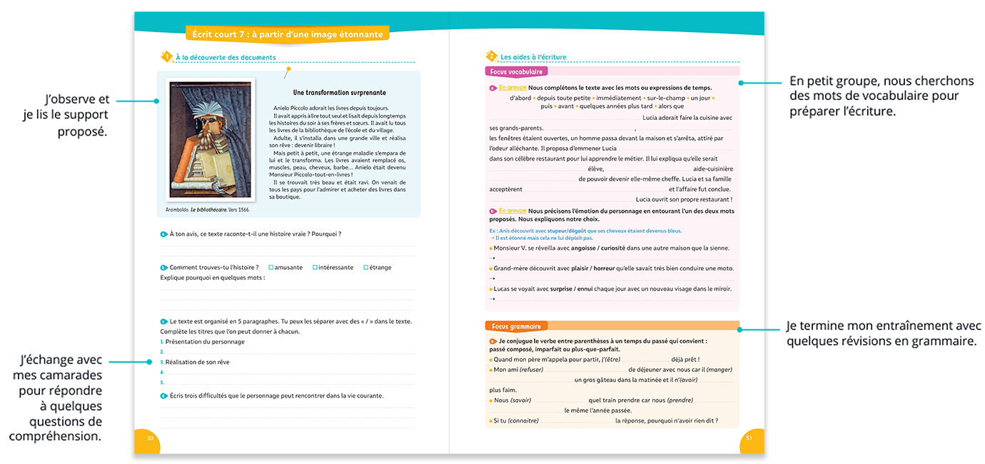 – Des projets d’écriture avec des écrits courts ou longs, à partir de supports textuels ou visuels variés et motivants : conte, e-mail, slogan, histoire policière, résumé... - Un focus vocabulaire et un focus grammaire visant à remobiliser les compétences utiles dans chaque projet d’écrit court.